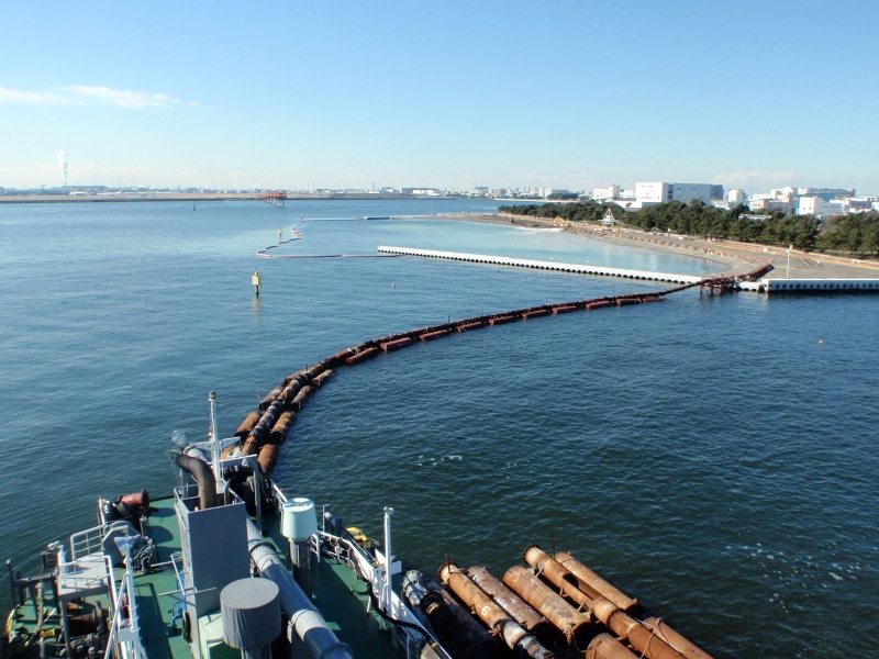 Our unique discharging technology is receiving high evaluation from the marine concerned. "Air pressure vessel" sends dredged soil to reclamation site with the power of pressured air through pipeline. "Barge unloader vessel" can mix water and dredged soil on board, then suck it with pump, and send it to reclamation site. They realize efficient reclamation reducing environmental burden. Improving marine environment as creating the marine-creature-friendly-environment by maintaining the beach is our another important activity.