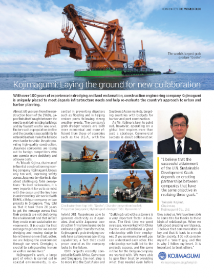 It is the world’s largest grab dredger “GOSHO” scooping enormous volume of soil from seabed in just a scoop with a roar. She is developed originally by KOJIMAGUMI as a work vessel. “Dredging” is like “a road work in the sea” creating channel by removing soil from the river or ports seabed. Recently deepening and expanding the channel has been required for large vessel’s safe voyage in world strategic ports and the degree of importance of “dredging” is getting higher than ever. Activate ports around the world with world’s top level dredging technology. That is our challenge!