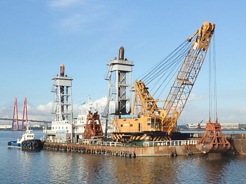 | Outline | Dredging:Grab dredging Unloading:Unloading by barge unloader Grab dredger(CHUKO MARU, 18m3)×1 Barge unloader(P-3000 RYOSEI MARU, 1800PS)×1 Pusher boat(2000PS)×1, Sealed box barge(1600m3)×2 |