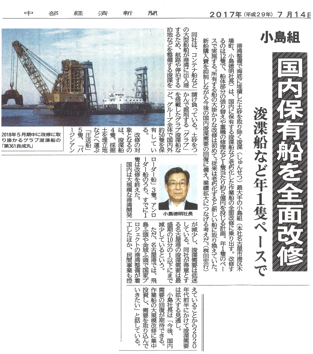 2017.07.14 中部経済新聞に小島組の作業船改修に関する記事が掲載されました 2017年7月14日付けの「中部経済新聞」に、小島組の作業船に関する記事が掲載されました。 クリックでポップアップ表示します。