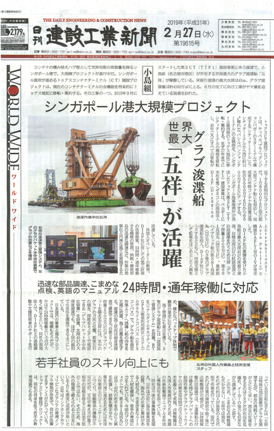平成31年2月27日発行の日刊建設工業新聞に、グラブ浚渫船「五祥」及びシンガポールでの工事に関する特集記事が掲載されました。