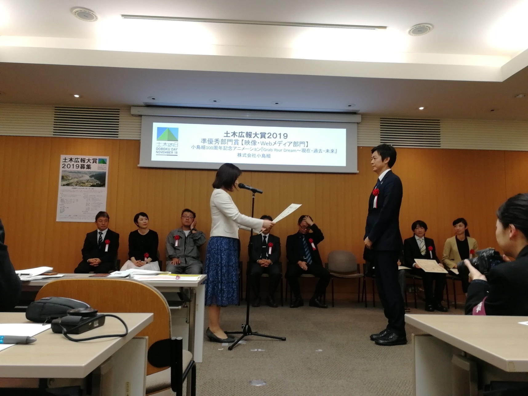 当社が創業100周年を記念して製作したアニメーション「Grab Your Dream~現在・過去・未来」が土木広報大賞2019の映像・Webメディア部門にて準優秀部門賞を受賞し、11月18日に(公社)土木学会 講堂において開催された表彰式で、表彰状が授与されました。