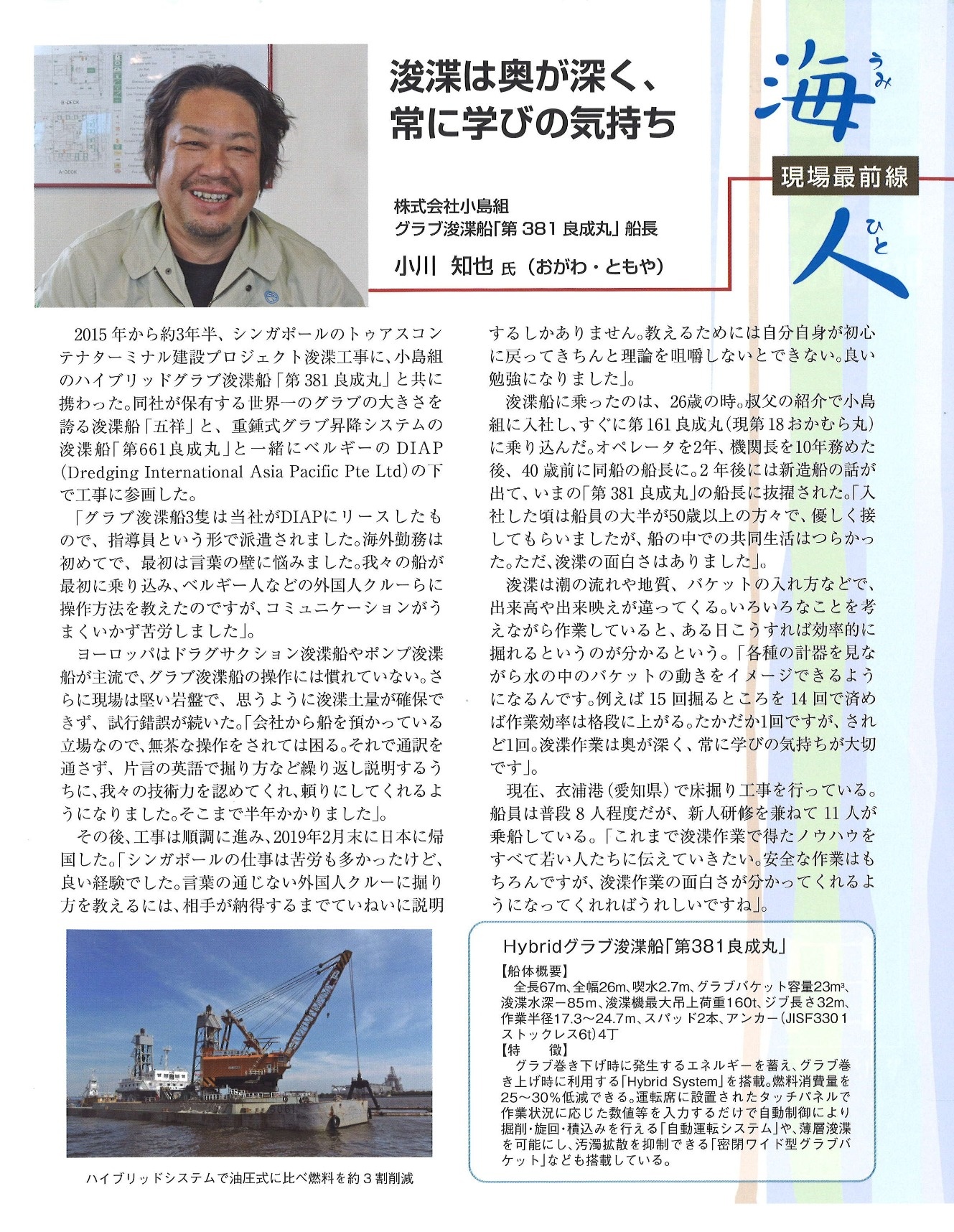 一般社団法人 日本埋立浚渫協会 会報「Marine Voice21」Vol.310(2020年8月発行) 現場最前線 海人に、「第381良成丸」船長 小川知也のインタビュー記事が掲載されました。