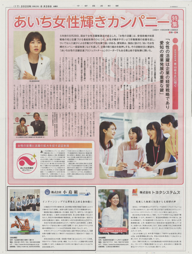 2020.08.31 中部経済新聞に記事が掲載されました 2020年8月28日発行の中部経済新聞 「あいち女性輝きカンパニー」特集に、インタビュー記事が掲載されました。 詳細は下記の記事をご参照ください。 ・中部経済新聞 「あいち女性輝きカンパニー」特集 ・掲載記事
