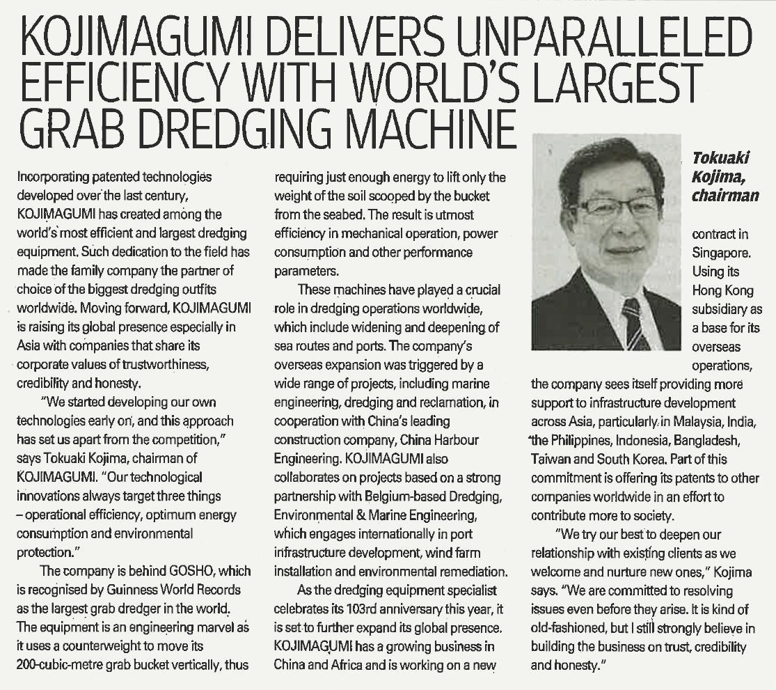 浚渫設備のスペシャリストは、本年創立103周年を迎え、さらに世界での存在感を高める。小島組は中国やアフリカで事業を拡大し、シンガポールでもプロジェクトに取り組んだ。香港子会社を世界での稼働拠点とすることで、特にマレーシア、インド、フィリピン、インドネシア、バングラデシュ、台湾、韓国といった国を初め、アジア全体でのインフラ開発により多くのサポートを提供できると考える。このコミットメントの一環として、社会にさらに貢献したいとの考えから、特許を世界の他社に提供している。