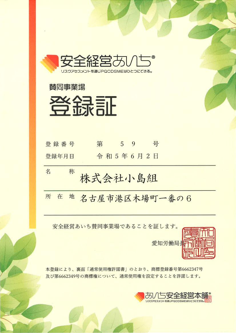 2023.06.29 安全経営あいち賛同事業場に登録されました 当社は令和5年6月2日付で愛知労働局の「安全経営あいち賛同事業場」に登録されました。 詳細は下記をご参照ください。 厚生労働省愛知労働局 ・「安全経営あいち」の推進 ・「安全経営あいち賛同事業場制度」について