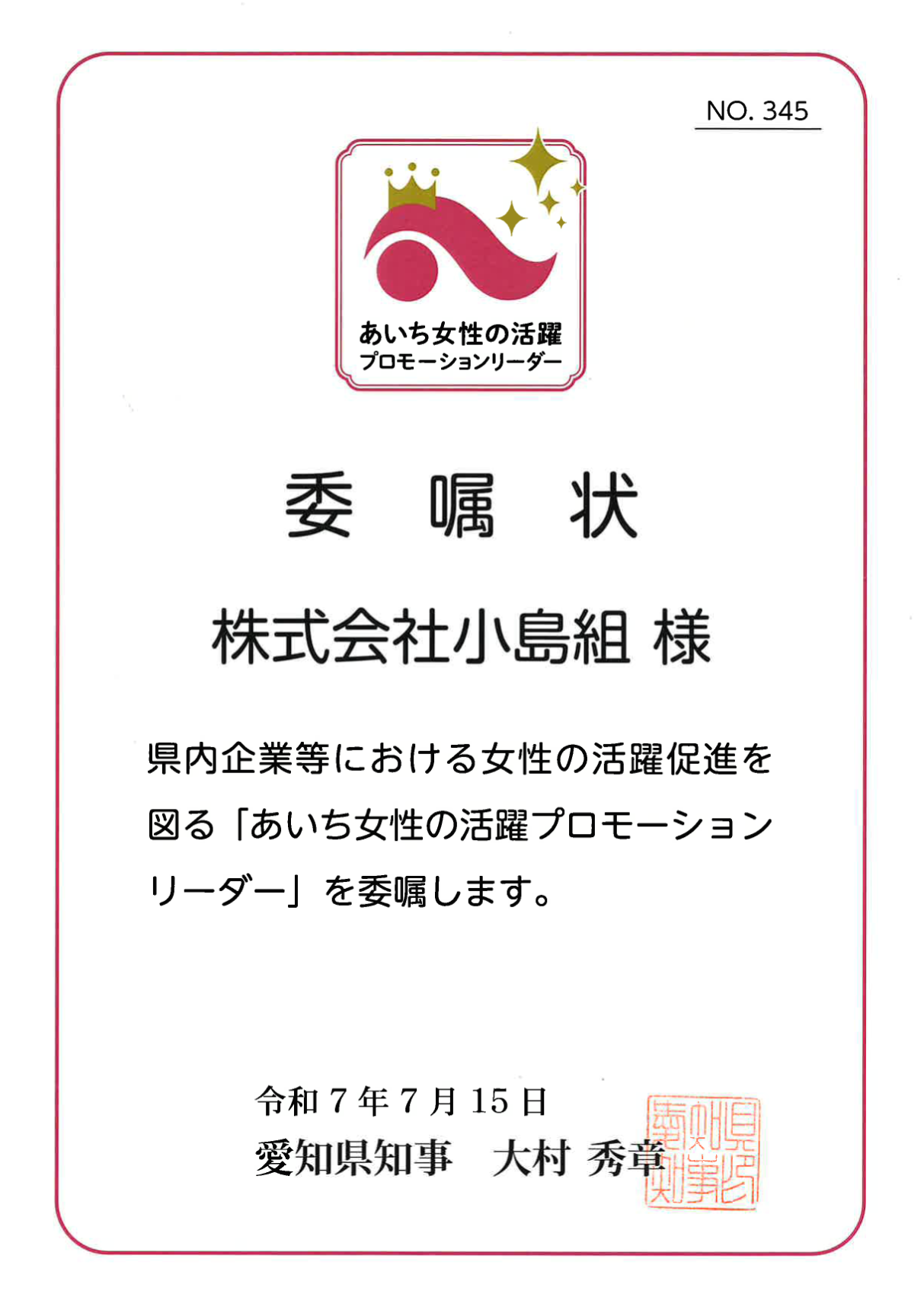 株式会社小島組は、令和7年7月15日に愛知県より委嘱を受け「あいち女性の活躍プロモーションリーダー」に就任いたしました。