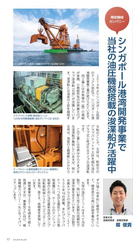 2017.10.13 川崎重工業のグループ報に五祥の記事が掲載されました。 川崎重工業株式会社のグループ報「かわさき 」第231号内で、小島組の作業船「五祥」及びシンガポールで施工中の工事についての記事が掲載されました。 クリックでポップアップ表示します。